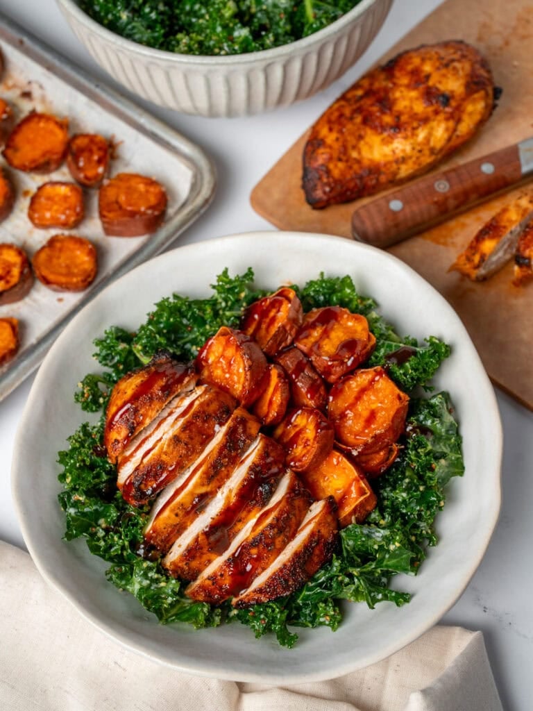 - Serve. Add the kale salad to bowls and top with the roasted sweet potatoes and sliced chicken. Drizzle with bbq sauce, if desired.