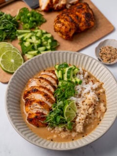 The whole thing comes together in about an hour to make an elevated high protein meal. And if you really want to maximize your time, double the recipe to use for this week’s meal prep.