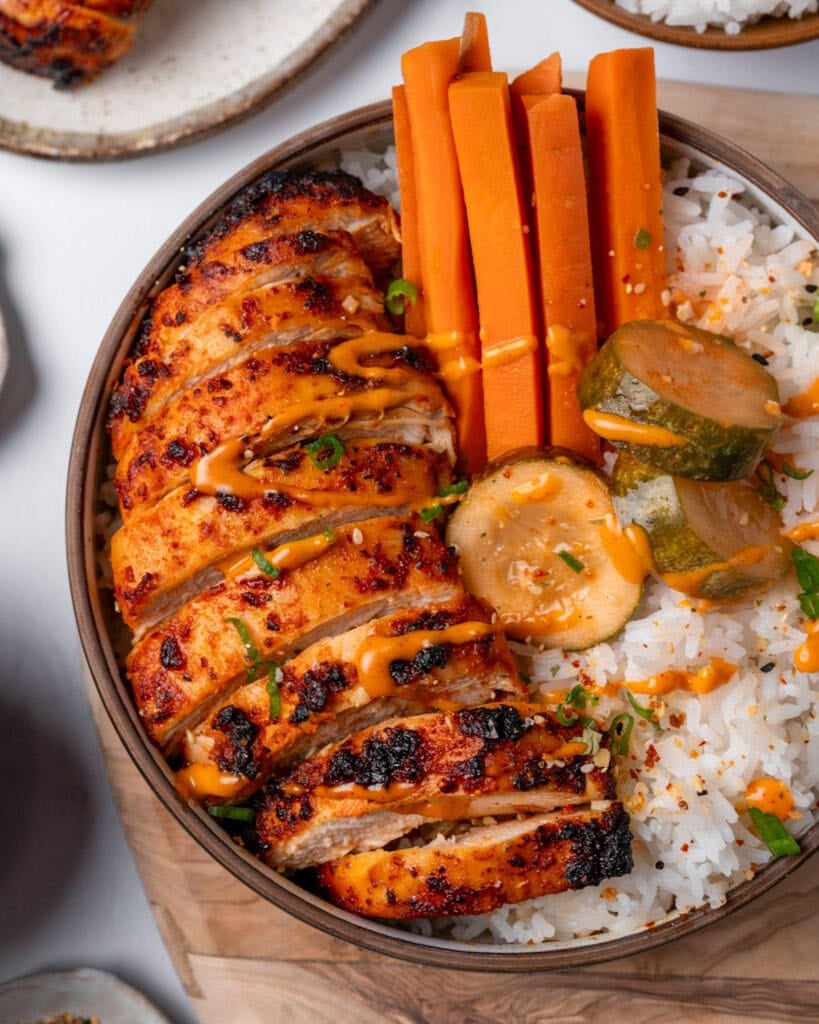 I also love a homemade cucumber crunch made with freshly sliced seedless cucumbers, toasted sesame oil, rice vinegar, soy sauce, and fresh herbs. Check out my Korean rotisserie chicken bowls for the specific ratios I like to use for homemade pickled cucumbers and carrots, a low calorie rice blend, and a creamy blended kimchi sauce.