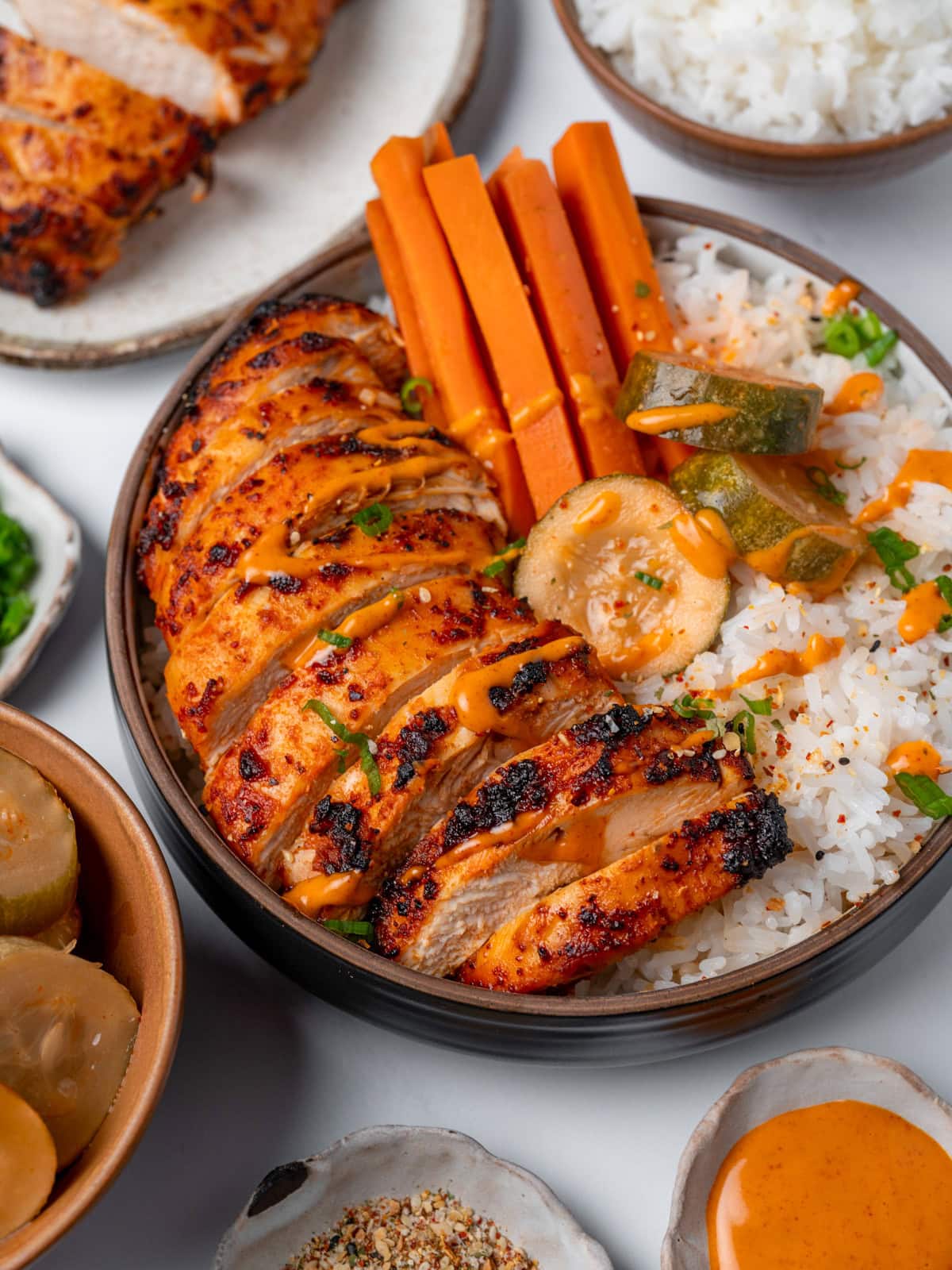 Pictured above you’ll see the air fried chicken sliced and served on a bed of steamed rice alongside kimchi pickles, pickled carrots, sesame garlic crunch, sliced green onion, and a creamy gochujang sauce.