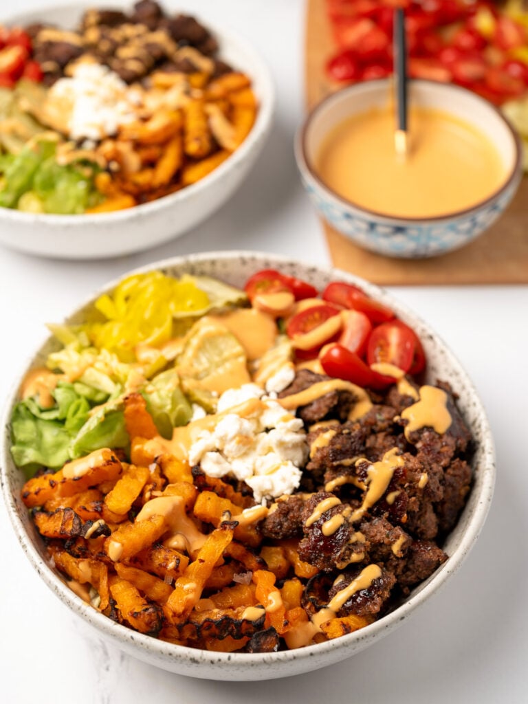 My take on burger bowls combines crispy seasoned extra lean ground beef with roasted butternut squash (or sweet potato) fries, low calorie burger sauce, and the usual burger toppings like lettuce, tomatoes, and pickles. The only thing missing is the bun. And thanks to the butternut squash swap, these burger bowls are very macro friendly and perfect for a high protein diet.