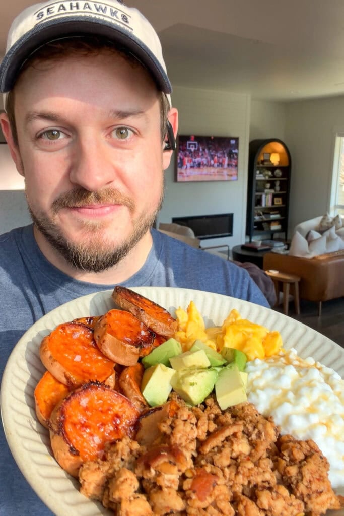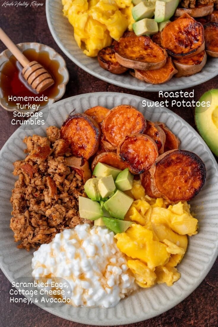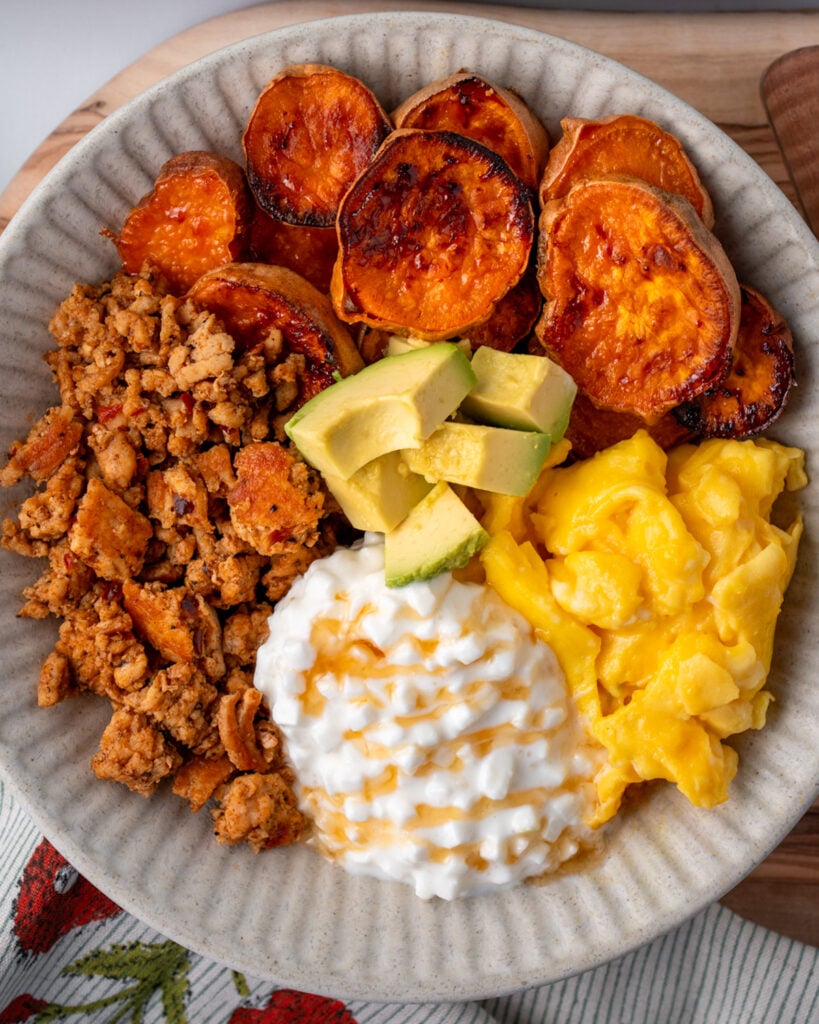 Allow me to introduce my current breakfast obsession. Each one of these breakfast sausage bowls has more than 50g of protein! They’re made with homemade turkey breakfast sausage crumbles, roasted sweet potato rounds, scrambled eggs, and optional additions like honey-drizzled low fat cottage cheese and avocado.