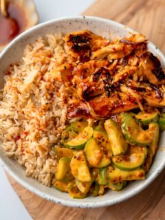 A 5-ingredient recipe for air fried nuggets tossed in a low calorie sauce that’s creamy, tangy, sweet, and spicy. Great for snacking or making protein bowls with rice and roasted veggies.