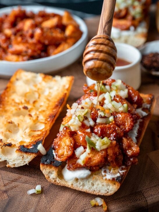 It works with both an air fryer or oven, though I greatly prefer air frying the chicken. The crispier the better when it comes to tossing the chicken in sauce.