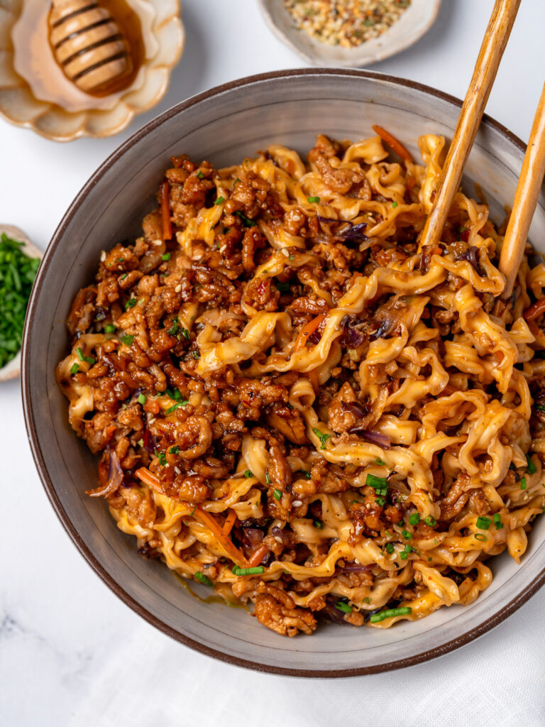 Looking for a way to upgrade instant ramen or products like Trader Joe’s and Momofuku instant noodles? Look no further than my crispy chicken noodle bowls. They’re made with ground chicken breast, a sticky sweet honey garlic sauce, coleslaw mix, and sesame soy instant noodles.