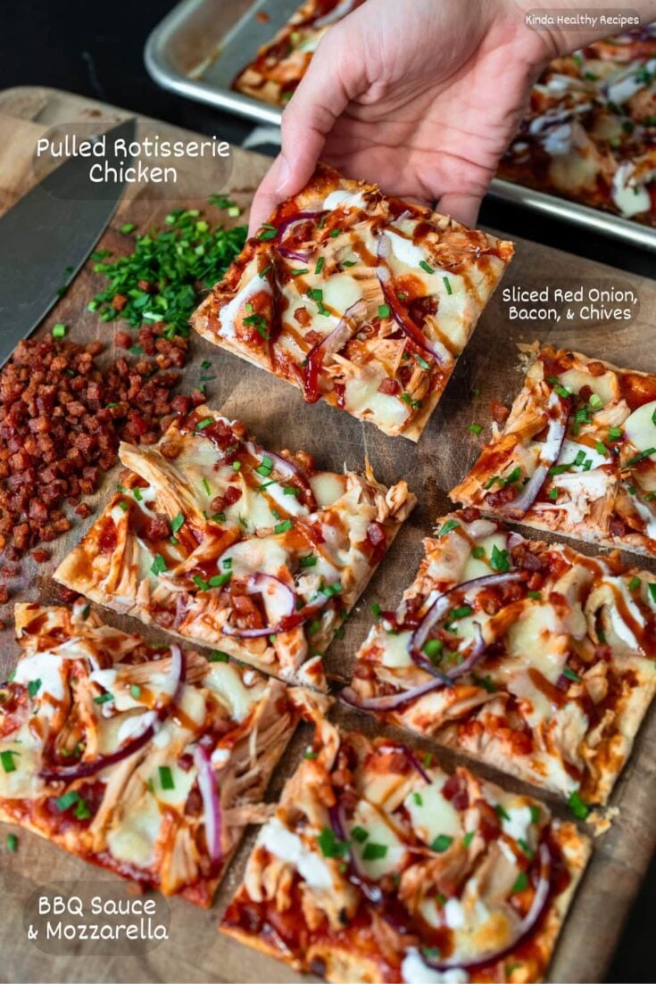 To spice things up, I have used a homemade sauce with Calabrian chili peppers, honey, and balsamic vinegar to make crunchy Calabrian chicken pizza that would work well here. The air fried frozen chicken bites in that recipe are another easy swap for rotisserie chicken, by the way.