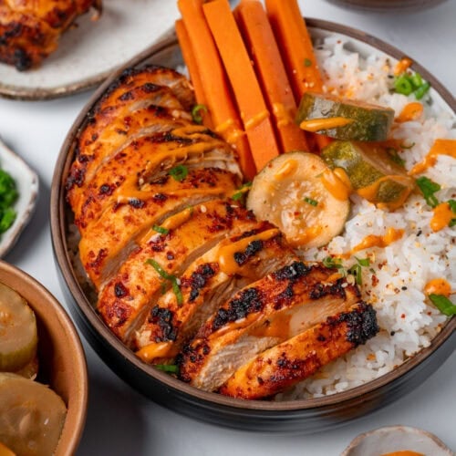 Air fried chicken breast seasoned with a blend of gochujang, Korean chile flakes, and spices.